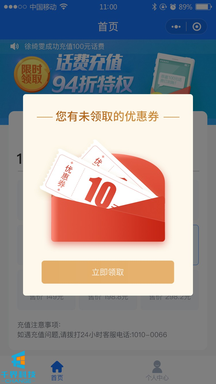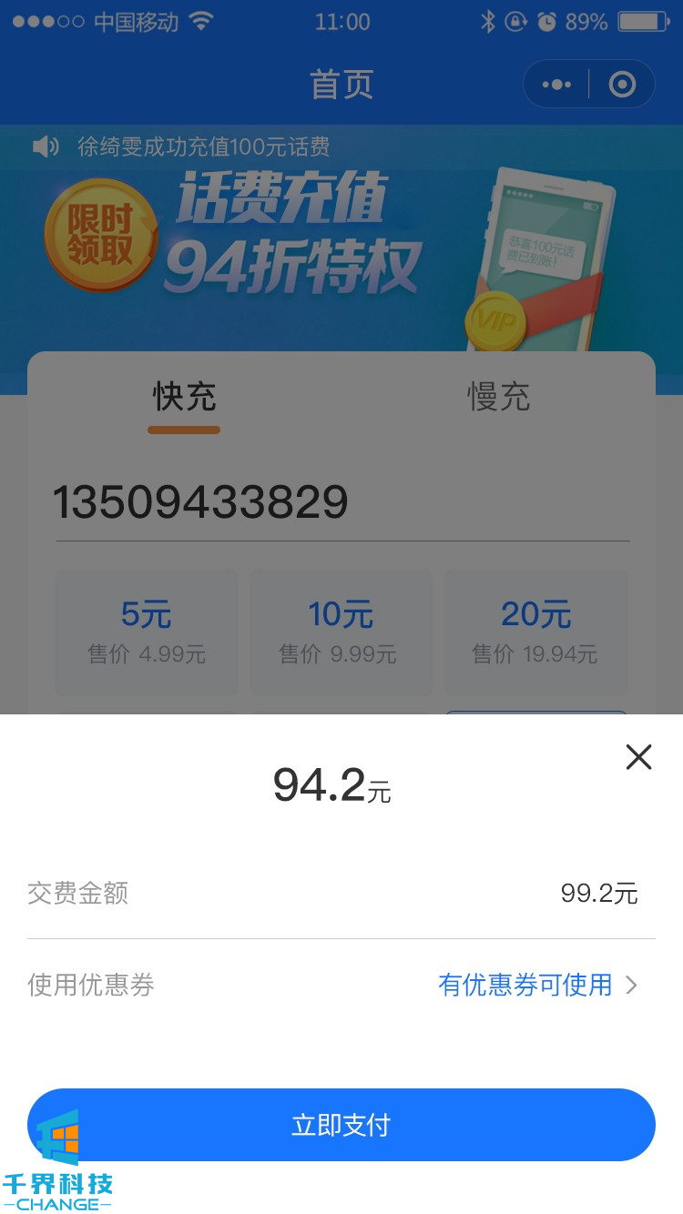 該項目為話(huà)費充值分銷(xiāo)小程序,包含慢/快充、有分銷(xiāo)、優(yōu)惠券等功能