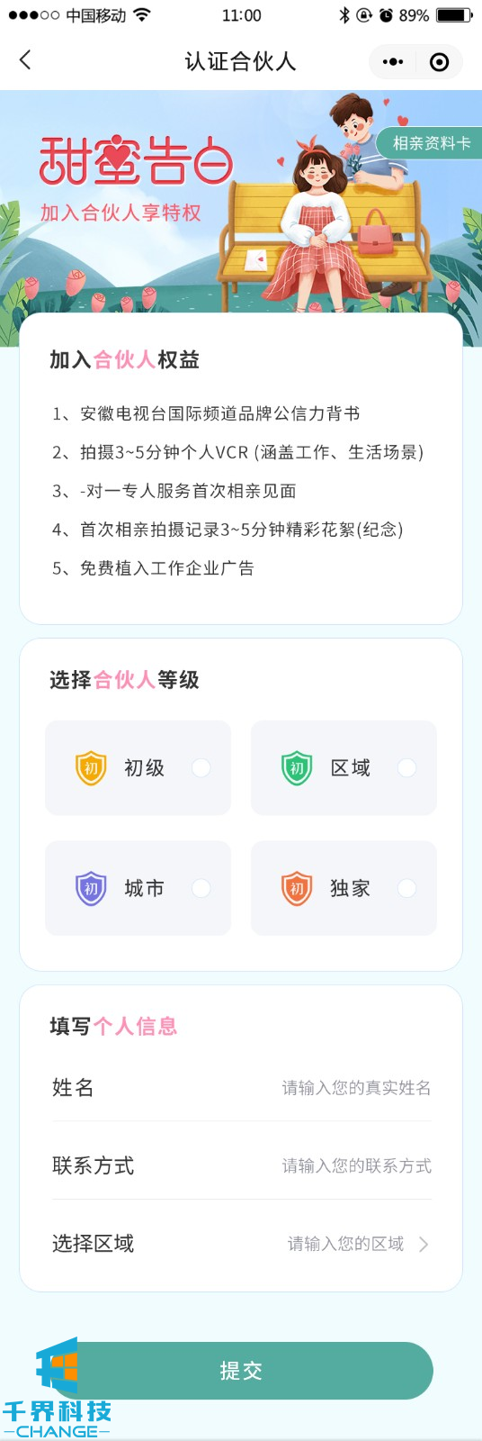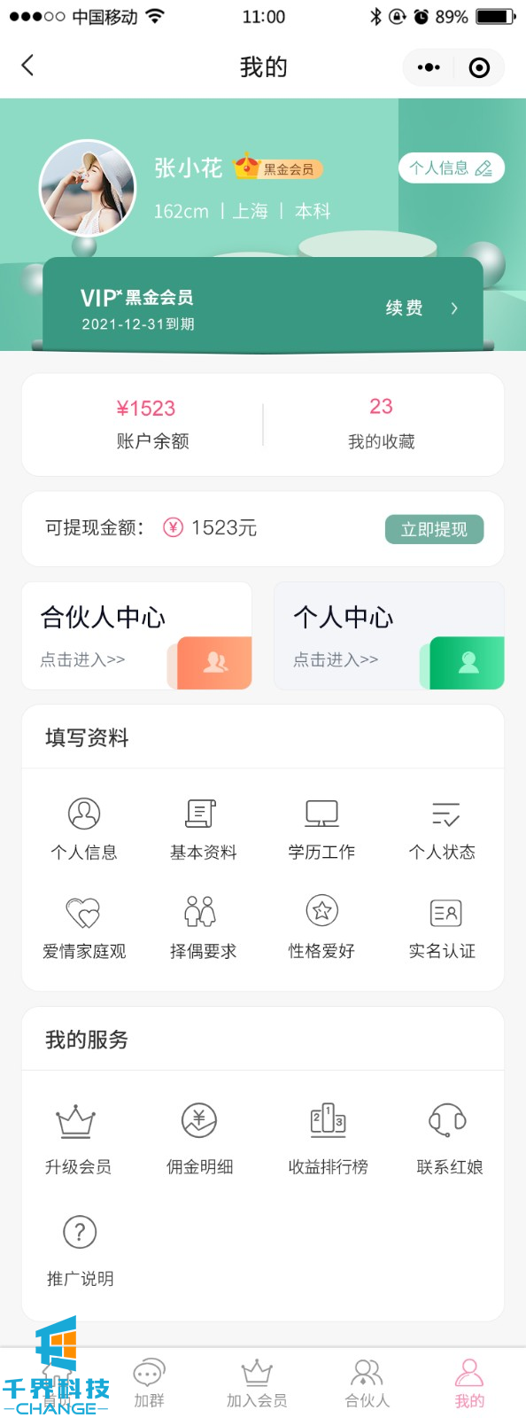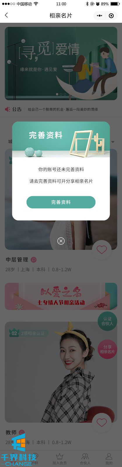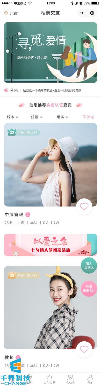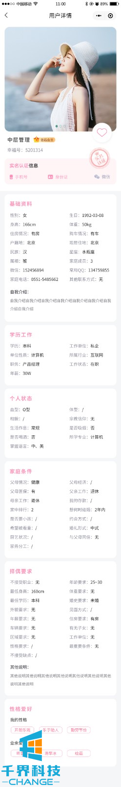 該項目是一個(gè)相親交友平臺,用戶(hù)可以完善信息生成自己的相親卡片,并可以成為平臺分銷(xiāo)商賺取傭金