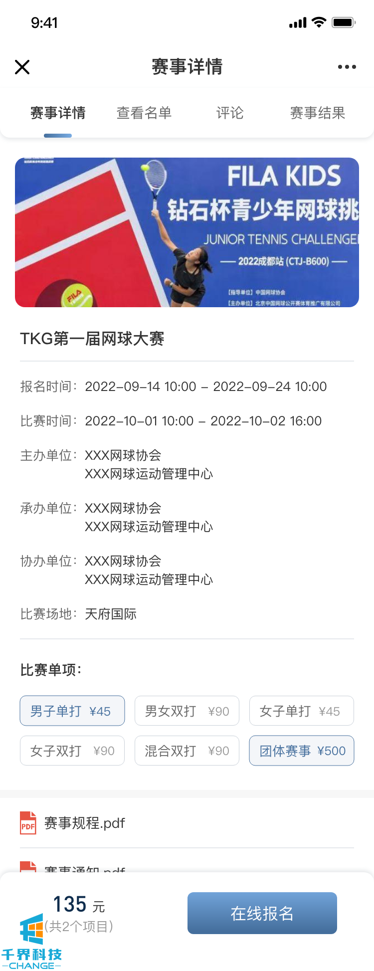 客戶(hù)做一個(gè)網(wǎng)球賽事報名的模塊,用戶(hù)線(xiàn)上可以選擇報名參加的網(wǎng)球賽事、項目,填寫(xiě)相關(guān)信息,下載比賽資料,查看比賽結果等功能