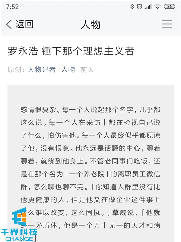 6月19日消息,此前“人物”在其微信公眾號上發(fā)表了一篇名為《羅永浩 錘下那個(gè)理想主義者》的文章,內容講述了錘子科技CEO羅永浩創(chuàng )業(yè)的往事。